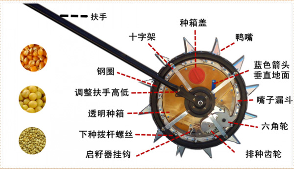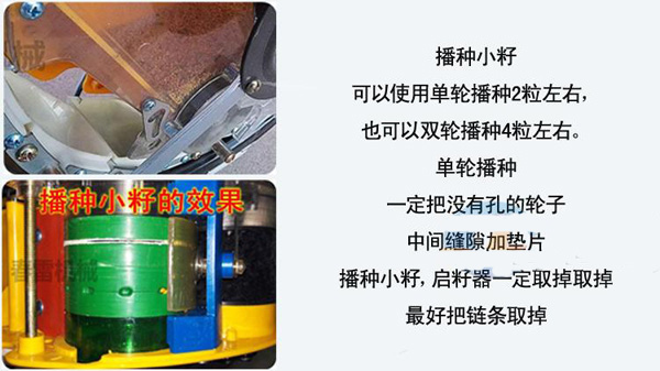 1、可以增減嘴子調整株距、根據籽的大小更換種輪。